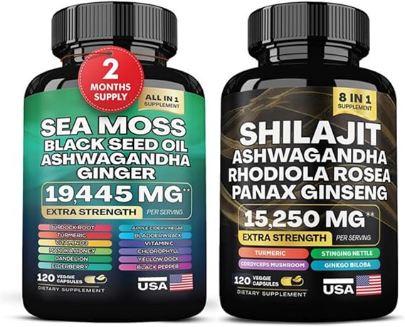 Effortless Duo: Dynamic Vitality Bundle Experience the simplicity and potency of our Dual-Bottle Solution. The revolutionary Dynamic Vitality Bundle offers the best of both worlds: the adaptogenic power of Shilajit and the nutrient-rich benefits of Sea Moss, thoughtfully packaged in separate bottles for your ultimate convenience.