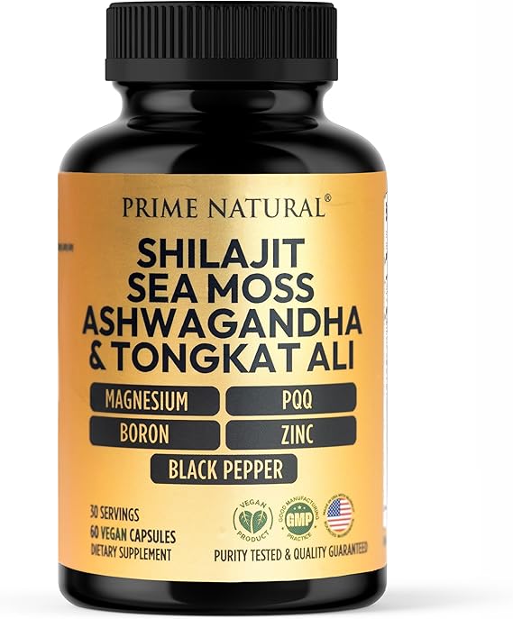 HIGH POTENCY FORMULA: Each capsule delivers a powerful blend of Shilajit 10,000mg, Irish Sea Moss 2000mg, Ashwagandha 3000mg, and Tongkat Ali 30,000mg, providing a comprehensive approach to support your overall wellness and vitality.
